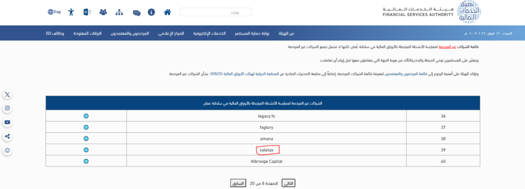 لكن في الوقت نفسه، يوجد تحذير رسمي ضمن I-SCAN يصنف “valetax” كجهة غير مرخصة/غير مسجلة وفق جهة رقابية في عمان بتاريخ 8 أكتوبر 2025.