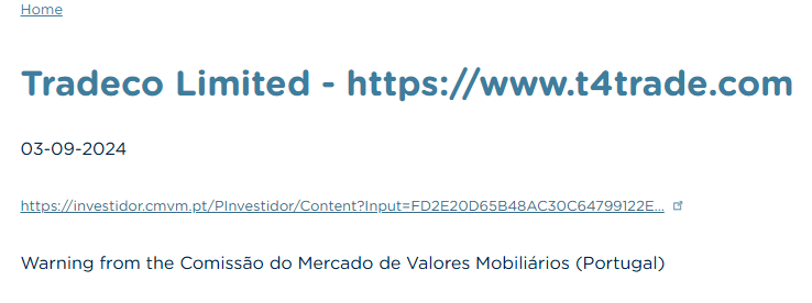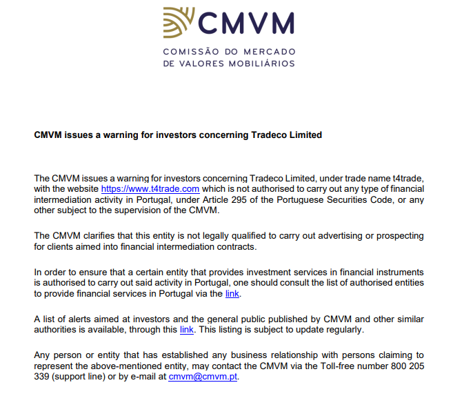 - تحذير CMVM البرتغالية: هيئة CMVM البرتغالية أصدرت تحذيراً صريحاً يذكر Tradeco Limited بالاسم ويفيد بأنها غير مرخصة بتاتاً لممارسة أي نشاط وساطة مالية في البرتغال.