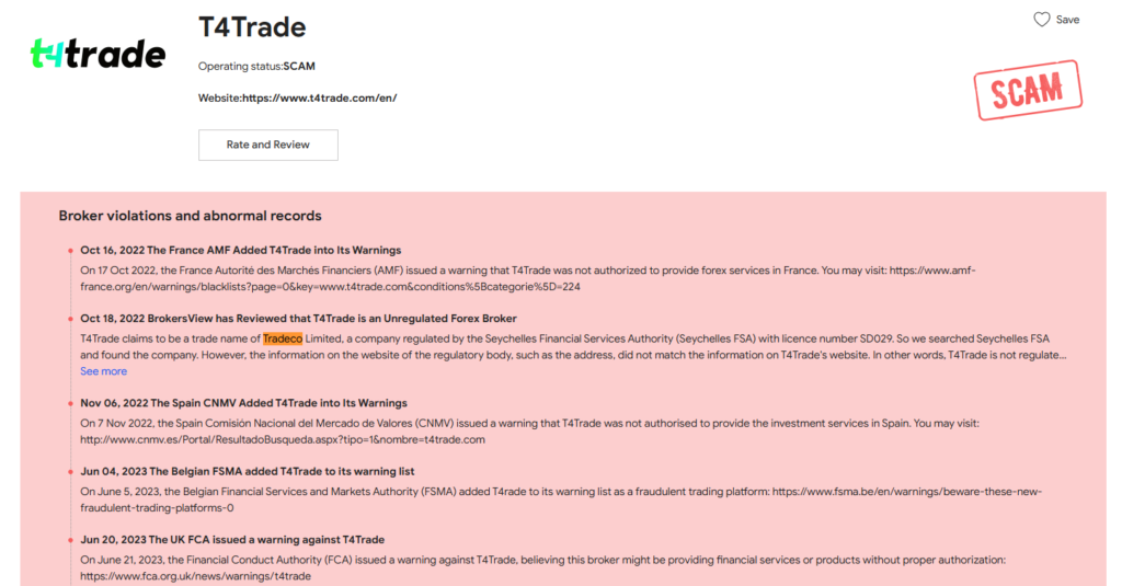 - BrokersView — تقرير T4Trade الكامل مع روابط التحذيرات الرسمية: وثّق موقع BrokersView جميع التحذيرات الرقابية ضد Tradeco Limited من 5 هيئات دولية، وأكد عدم تطابق بيانات الترخيص المسجلة لدى هيئة FSA سيشل مع بيانات المواقع الإلكترونية.